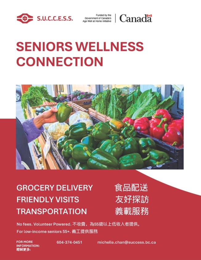 Age Well at Home – Senior Wellness Connection is designed to support seniors with grocery delivery, medical transportation, friendly visiting, and meal delivery services. The services are available to all senior 55+ and low income in all of Metro Vancouver. S.U.C.C.E.S.S. are currently focusing on enrolling new clients especially for meal delivery services and are looking to serve 20 seniors starting as early as July.